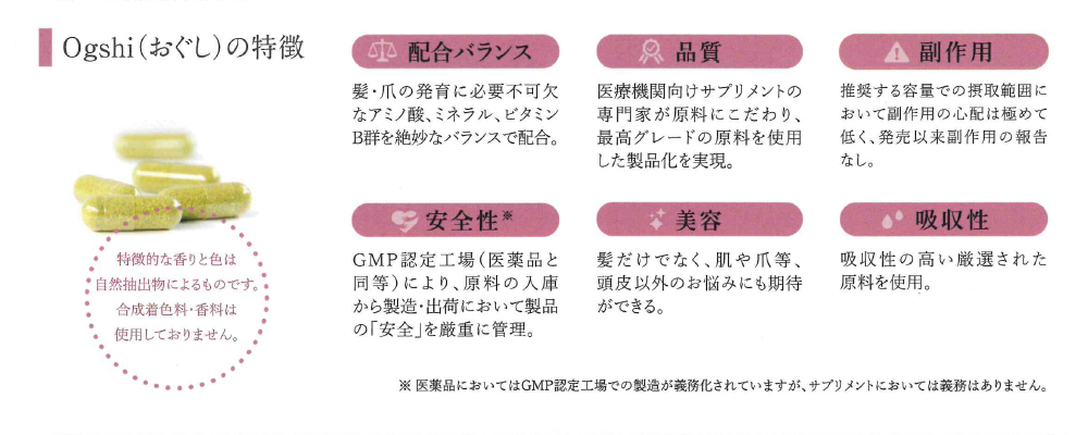 Ogshiサプリメントは日本人女性のための毛髪サプリメントです。育毛剤などの外側からのケアを行なっていても、毛根が栄養不足に陥っていると効果があまり見込めません。そこで、薄毛の日本人女性に不足しがちで、発毛・養毛をサポートする15種類の栄養素を手軽に摂取できるような栄養補助食品を開発しました。