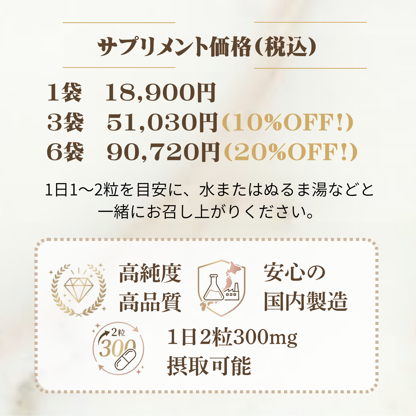 1日1~2粒を目安に、水またはぬるま湯などと一緒にお召し上がりください。